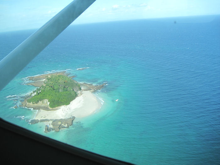 Kurz nach dem Start, Blick auf eine unbewohnte Nachbarinsel von Contadora.