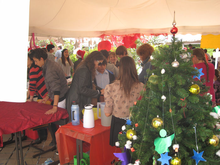 Im Dezember fand wieder ein Weihnachtsbazar an der Schule statt. Hier sieht man Eltern und Schüler meiner Klasse an unserem Stand. Wir haben Weihnachtsbaumschmuck verkauft und Kinder geschminkt. Dazu gabs Kekse und einen alkoholfreien Glühwein.