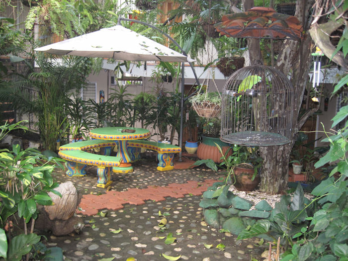 Im Innenhof des Hotels ein tropischer Garten mit Papagei...
