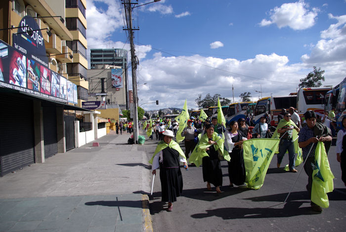 Vor ein paar Tagen war der 10. August. An diesem Tag wird die Unabhängigkeit Quitos gefeiert. Hier ist ein Umzug zu sehen, bei dem Anhänger des Präsidenten ihre Sympathien mit Fahnen und Plakaten kund tun. Zu dieser Veranstaltung, die ganz in der Nähe meiner Wohnung statt fand, sind bestimmt 300 Busse gekommen. Die Straßen waren gesperrt und ich kam kaum nach Hause.