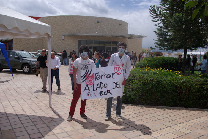 Zum Glück gab es auch einige von Schülern ausgerichtete Attraktionen. Hier wird für eine Geisterbahn geworben. Die Schweinegrippe war natürlich auch ein Thema. Im Hintergrund die Autoausstellung.