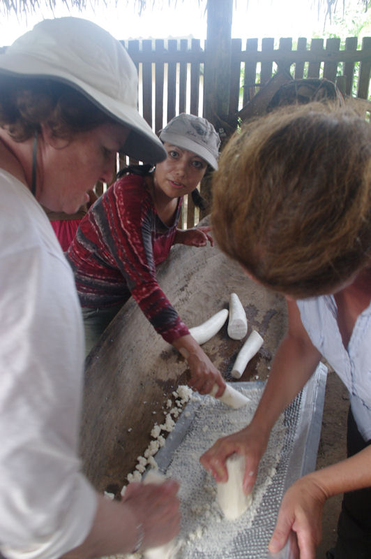 Unterwegs hielten wir an, um Yuka (Maniok) zu ernten. Im Dorf wurde daraus dann zunächst ein Brei gerieben...