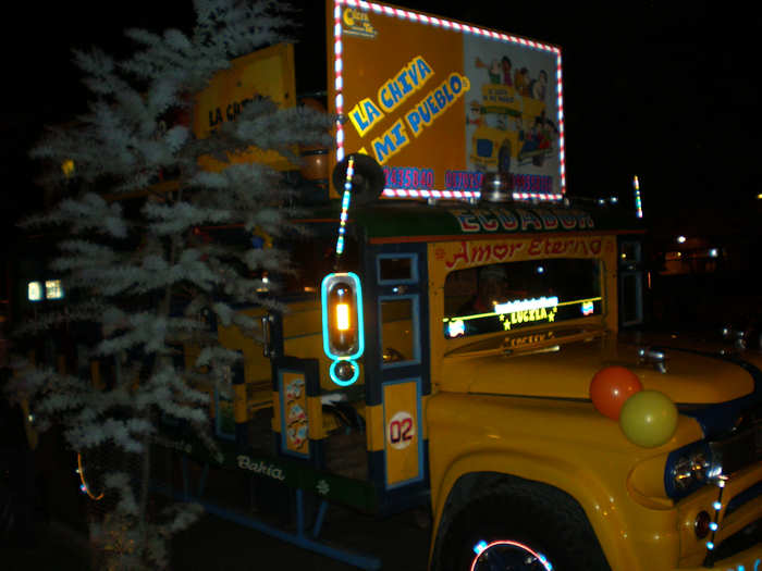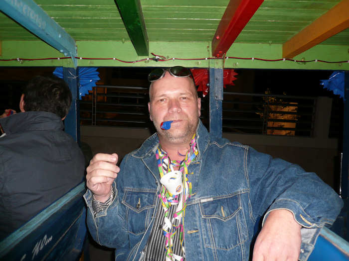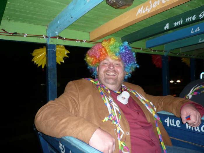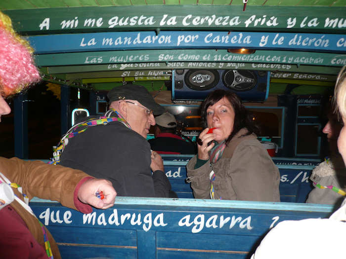 Ich bekam eine bunte Perücke auf und jeder bekam einen Plastibecher um den Hals gehängt, der dann immer wieder mit Canelazo gefüllt wurde.