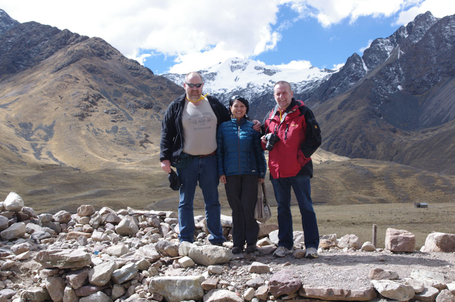 3 Reisende vor Bergpanorama auf 4335m Höhe.