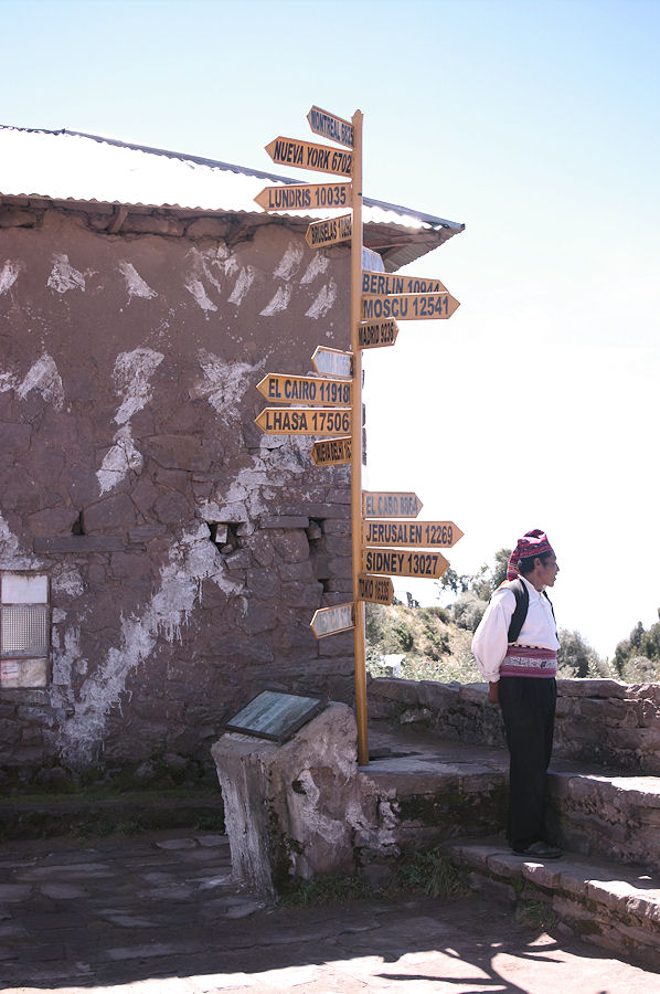 Insel Taquile. Am Rande des Hauptplatzes Entfernungsangaben zu weit entfernten Orten...