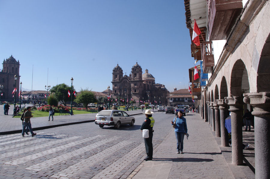Der zentrale Platz (Plaza de Armas) von Cusco. Mit der Kathedrale im Hintergrund.