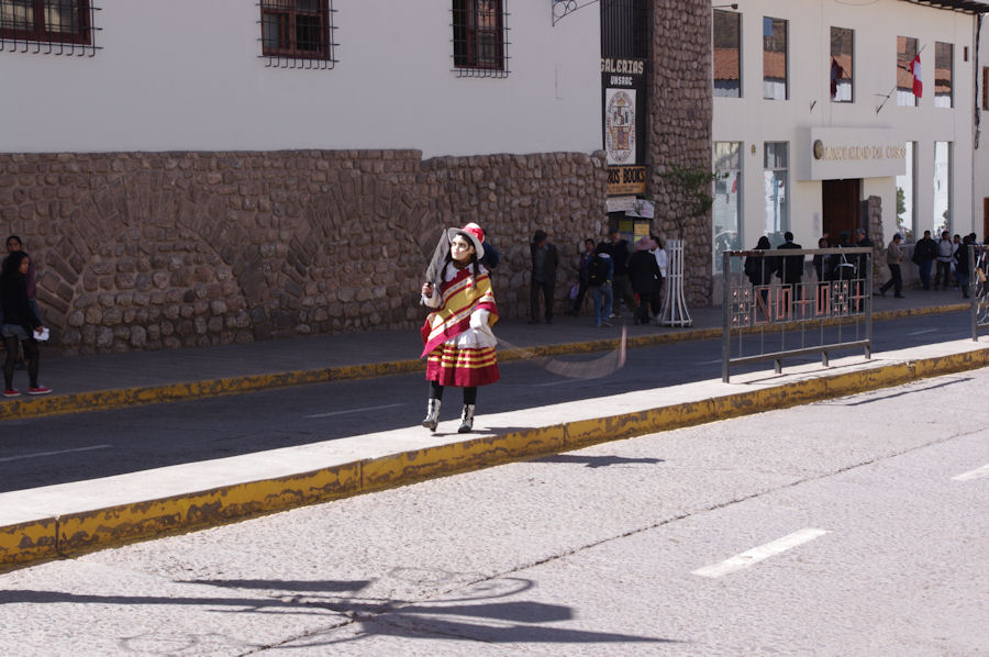 Wieder zurück in Cusco. Diese verkleidet Frau ist mit einer Peitsche ausgerüstet und wenn ein Fußgänger unachtsam über die Straße geht, gibts was hinten drauf. :-)